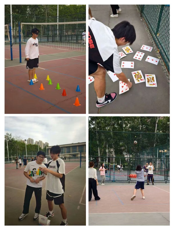 随后进行的“同心击鼓”将团队协作推向高潮。九人一组,各执一绳,通过默契配合控制鼓面颠球。起初排球频频落地,但随着一次次练习与调整,团队节奏逐渐统一,击球次数不断攀升。同学们在协同努力中深刻体会到信任与配合的力量。